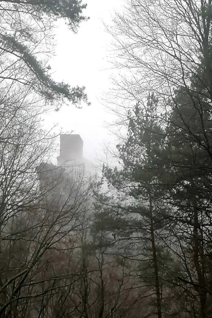 Der Abstieg geht hinunter nach Bindersbach und auf der anderen Seite der Trifelsstraße durch den Wald in Richtung des Rehbergparkplatzes. Ohne die Gipfel des Rehbergs, Scharfenberg und Anebos zu erklimmen – statt dessen bleiben wir auf unterhalb entlang führenden Wanderwegen – haben wir eine Netto-Laufzeit von 2,5 Stunden bei knapp elf Kilometern. Auf Trifels haben wir eine Rast eingelegt. An diesem Tag haben wir leider Pech, außer Nebel ist nichts zu sehen und das Burgtor ist auch noch geschlossen.